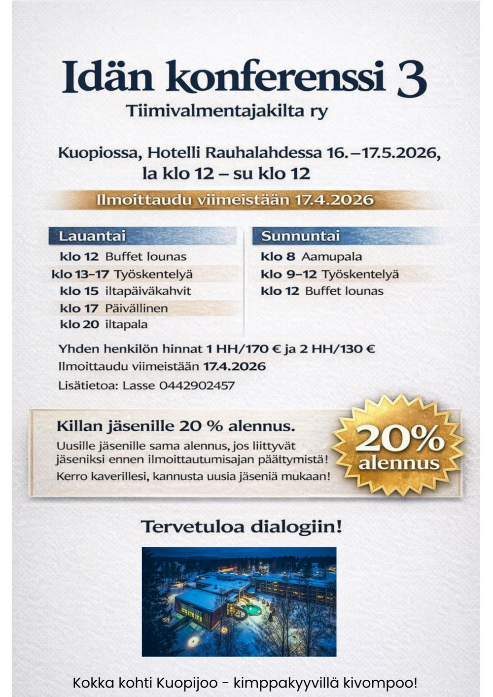 Ilmoittautumislinkin voit tilata osoitteesta info@tiimivalmentajakilta.fi